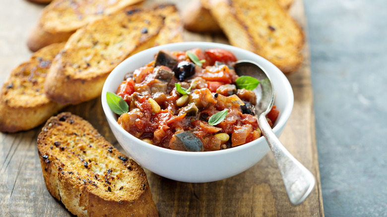 Caponata comes from the Italian island of Sicily. It's made with a mix of Sicilian staples like eggplant, capers, olives, onions, and pine nuts. The eggplant gives the dip a meaty texture, the salty olives and capers contribute a tanginess, and the pine nuts give it a crunch.