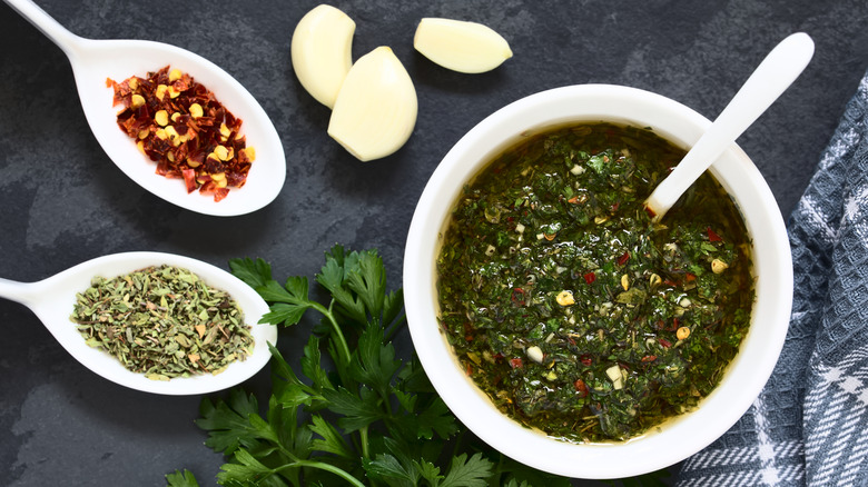 In Argentina, there is a green oily sauce called chimichurri. This sauce — which plays a central role in the cuisine — is made with parsley, cilantro, oil, chili, and garlic. Either lemon juice or vinegar is also added, providing an acidic component to the dish. Some recipes swap out the cilantro for oregano, and others add both.