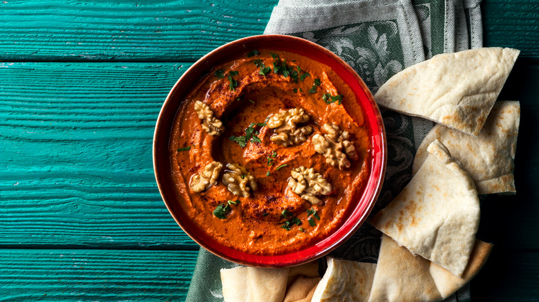 Muhammara tastes both smoky and sweet. The dip can have a little texture or be blended until it's completely smooth. The dip is served with pita bread, crackers, fresh veggies, or kebabs.