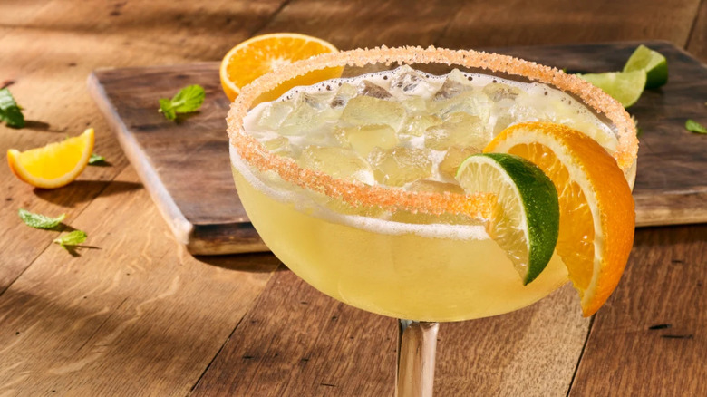 After you've tried the Blue Amalfi, there are quite a few other options to try from the Olive Garden drink menu. For starters, let's talk about the chain's popular Italian margarita. Recipes for this classic cocktail vary widely but Olive Garden chooses to make theirs with the addition of Italian-inspired flavors — namely, amaretto. This colorful pick includes the standard triple sec and Jose Cuervo Especial Silver Tequila, as well as an orange and classic lime for garnish.