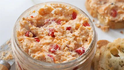 Pimento cheese is a soft cold cheese dip with added pimentos; it has a reputation for being a staple in Southern homes in the United States. However, the development of this mildly flavored spread was actually developed up north. One of the earliest recipes for pimento cheese in the early 1900s consisted of soft cream cheese, chives, minced pimentos, and mustard.