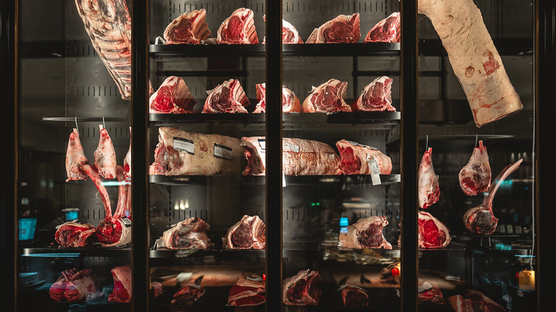 While the highest graded beef in restaurants, hotels, butcher shops, and grocery stores in the United States also comes from younger cattle, there's a different kind of age that impacts a steak's price and it comes in the form of dry aging. Essentially, dry aging beef is a process of controlled rot or decay after a cow has been slaughtered. Just like aged cheese and fermented foods, aged beef is exposed to factors that control the decay process of the meat to help elicit specific flavors and characteristics.