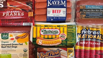 Coming in at No. 6 six is Ball Park brand beef hot dogs. They've got that classic hot dog flavor you know and love, one that takes you back to hot summer days and backyard BBQs. They aren't super salty but offer a good balance of salt to meat. However, the texture is where these hot dogs start to lose steam. While they have that traditional flavor, they don't have that much-anticipated snap, and the mouthfeel was mushy and unpleasant.