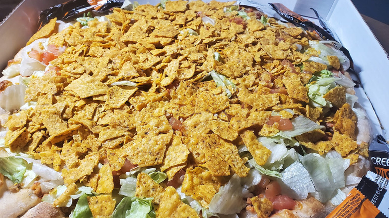 QC Pizza is one of the joints that also offers taco pizza. Here, it's topped with sausage that was cooked in taco seasoning. Instead of the traditional mozzarella, cheddar cheese is used. Then lettuce and tomatoes are added and topped with a layer of crushed Doritos. What makes QC Pizza notable is that it offers Quad City-style pizza in Minnesota.