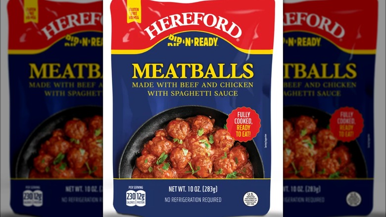 Additionally, Hereford Meatballs with Spaghetti Sauce contain 5 grams of sugar per serving. And while the product arguably cuts back somewhat on fat due to using a combination of chicken and beef, there's still a pretty large amount of saturated and trans fats. And these high proportions aren't necessarily reflected in its calorie count.
