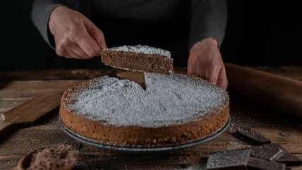 The key to flourless chocolate cake isn't what it lacks (flour) but rather what it adds to make up for that absence. These baked goods usually have more fat in them than wheat flour cakes in the form of butter and eggs. A typical chocolate cake recipe calls for about two to three eggs, but flourless cakes like Torta Caprese often require five eggs, along with a cup or so of butter. They also include melted chocolate, while a classic chocolate cake has only cocoa powder. These additions give flourless chocolate cake a superbly silky texture. To complement this richness, Torta Caprese is classically served with a scoop of vanilla ice cream.