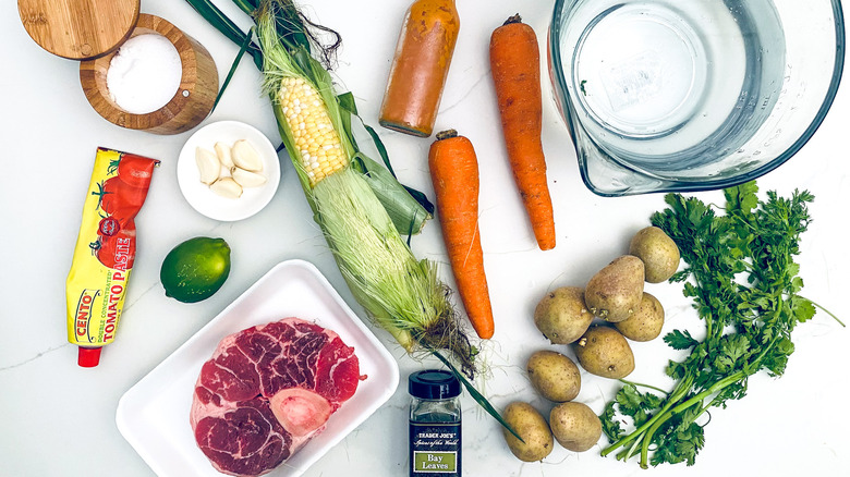 To make this comforting caldo de res dish, you can start by gathering your ingredients. For this recipe, you will need water, beef shank, garlic, bay leaves, salt, carrots, corn, potatoes, cilantro, tomato paste, lime, and hot sauce.