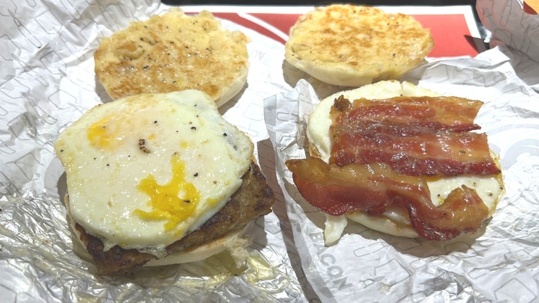 When it comes to breakfast, Wendy's has been chasing the success of McDonald's and Burger King for almost four decades. The fast food chain first expanded into the a.m. hours in 1985 with made-to-order omelets, which were not so much runny, but running too late to remain fast food. Through the years, other items have come and gone, with the chain finally finding breakfast success in the last few years. Eaters have gobbled up the Breakfast Baconator, Hot Honey Chicken Biscuit, and Homestyle French Toast Sticks, with a side of seasoned potatoes. Now, in late summer 2023, Wendy's is ready to offer up a new bread option for breakfast sandwiches: In addition to buttermilk biscuits, croissants, breakfast rolls, and premium buns, you can now order an English Muffin.