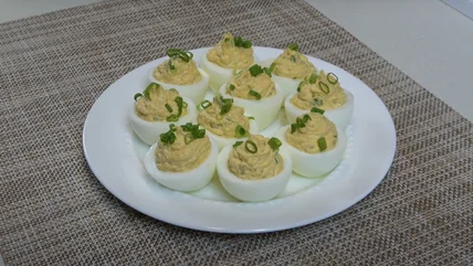 Next, cut the eggs in half lengthwise and remove the egg yolks. Place the egg yolks in a bowl and mash them until they're crumbly. Then, add ½ cup of mayonnaise and ½ cup of cream cheese. Mix the ingredients together and add 1 can of drained crabmeat and 1 sliced green onion and mix again. Using a plastic bag, pipe the egg yolk mixture back into the egg whites, top them with a wonton strip, and some more sliced green onion. Now serve them up at your next party and enjoy the fruits of your labor!