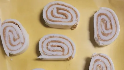 For regular potato candy, you'll need 1 tablespoon of milk, 1 teaspoon of vanilla, about 6 cups of powdered sugar, a pinch of salt, and ⅓ cup each of peanut butter and cold mashed potatoes. Next, mix the milk, vanilla, salt, and mashed potatoes together until combined, then slowly add the powdered sugar 1 cup at a time. When you have a stiff dough, turn it out onto a surface and roll it out flat. Then spread it with peanut butter, roll it up into a log, and cut it into slices.