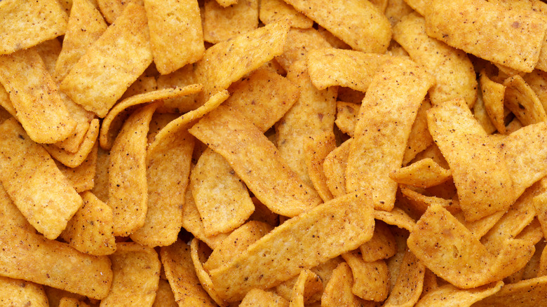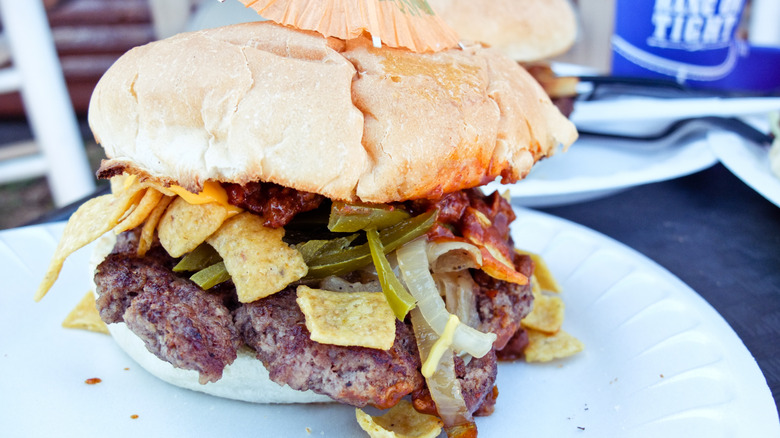 Of course, adding Fritos as a burger topper can get even more elaborate. Revive the classic Frito Pie by mixing Fritos with chili and diced onions to pour over a plain cheeseburger, or add a favorite Frito dip flavor to the hamburger. Don't be afraid to try various combinations and other condiments, like a barbecue Frito chili pie burger, the next time you feel like indulging. If that Frito Pie topper or the chips escape the confines of the bun, don't fret. Scoop the corn goodness back onto the bun, or eat them in lieu of french fries or other chips.