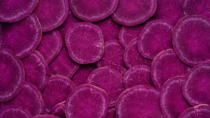 The deep purple color of these sweet potatoes comes from a naturally occurring compound called anthocyanin. A known antioxidant, it's what gives most red, purple, and blue plants their color. Usually, foods this high in anthocyanins are bitter, but not purple sweet potatoes.