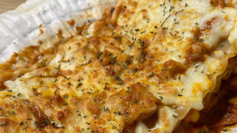 The best way to reheat lasagna for a deliciously crispy top is to use the oven, but it takes at least 30 minutes. If you're short on time, heat it in the air fryer for 10 minutes or until warm. Transfer the lasagna to an oven-safe pan, cover it with aluminum foil, and then pop it in the air fryer. This trick works for frozen lasagna, too; just make sure you remove the plastic wrap or foil before reheating it.