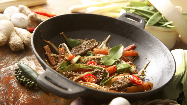 While any meat can be chucked into a stir-fry, beef tends to be a popular choice across cuisines, from a Thai beef stir-fry with basil leaves to Korean-style japchae. As for the cut of beef to use, it is best to choose one that is flavorful and can be thinly sliced and flash-cooked at high heat. A tough cut of meat like brisket, for example, doesn't work well as it has a lot of connective tissue and fat that needs to be slow-cooked until it is tender. When it comes to a stir-fry, a lean cut of beef like sirloin is best suited for the purpose, as well as being both tender and economical.