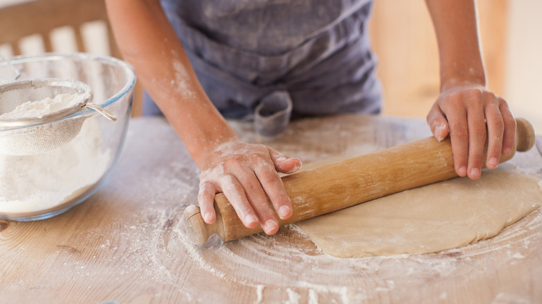 To make the process a bit easier, hold the rolling pin at an angle as you scrape. That way, you'll have a better grip on it while you're moving the bench scraper downward. You can also rotate the pin to ensure all stuck-on food bits are removed. While it's good to have a plan for rigorous cleaning, regular cleaning is equally important to ensure the rolling pin lasts.