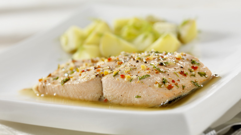 As far as how long to give it, as noted, poaching isn't something you want to rush. It's not going to take hours like braising does, but it's not going to be done with the speed of a sear, either. Again, this depends on the protein you're working with; fish will typically be done in around 10 minutes, while chicken or beef will be closer to 15 to 20 minutes. It's also probably a good idea to cut into the meat to make sure you're not dealing with undercooked chicken — nobody wants to eat a likely Salmonella Surprise.