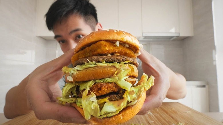 This burger takes surf and turf to the next level. It's also just as it sounds, with a beef patty, fish filet, and crispy chicken burger stacked on top of one another. You'll also find a slice of melted cheese, tartar sauce, pickles, ketchup, and mustard.