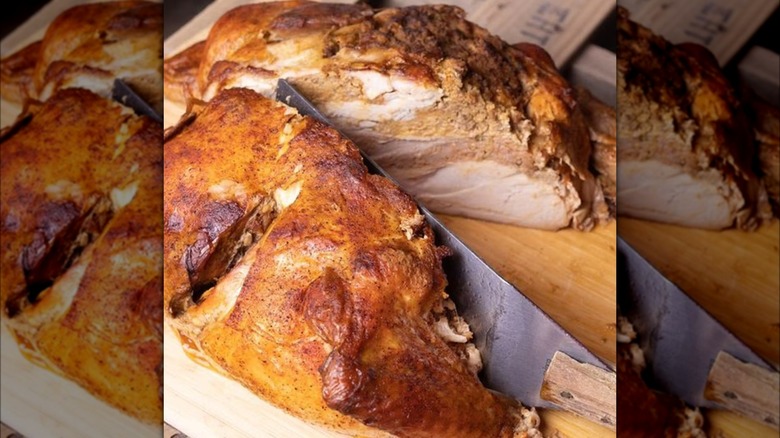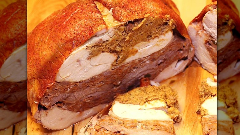 This turducken layers its stuffing between each of the three types of meat and tops the whole affair with a bespoke seasoning blend. The combination of red pepper, paprika, parsley, and the Cajun holy trinity of onions, celery, and green bell peppers gives the stuffing and meat a savory depth. While it may all sound overwhelming, customers are quick to note the deliciousness of this joint of meat, and Hebert's gets extra bonus points for reliable delivery.