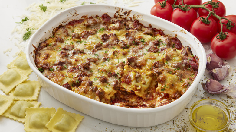 While lasagna isn't the most complicated dish in the world to master, it does take time to layer all the components properly so as not to tear the broad, thin sheets of noodles that make up the recipe's foundation. If you don't have all day but still want to turn out a comforting lasagna bake, look to frozen ravioli. The popular shortcut, affectionately known as "Lazy Girl Lasagna," or simply Lazy Lasagna, will still feature all your favorite things about lasagna — tomato sauce, cheese(s), pasta, and ground beef if you want it — but will come together in about half the time. As a bonus, the ravioli filling will give the dish added flavor.