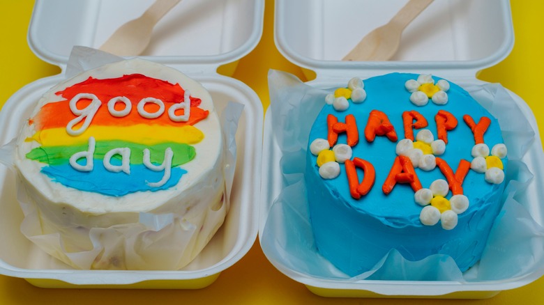 These tiny cakes fit snugly into small styrofoam takeout boxes, making them easy to pack into lunchboxes or give as gifts to loved ones. They're often decorated with cute designs and pastel colors and are single-serving cakes (that's not to say you can't share one if you want to).