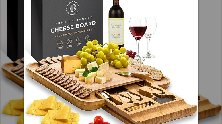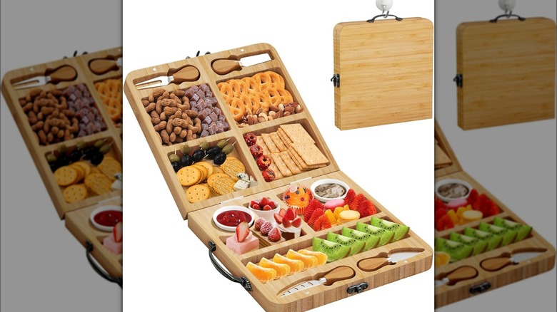Besides the design that makes travel easy, this board is made from sustainable bamboo. The surface is easy to wipe down and it won't take up a lot of space in your cabinets when you store it. Your friends and family will adore this board as it allows a little something for everyone with handy cheese knives, small dishes, and lots of compartments and it's priced affordably on Amazon.