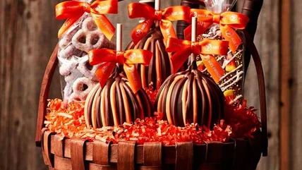 The woven, stained wood basket is filled with the goodies of fall. It has three apples: one triple chocolate autumn jumbo apple and two fall triple chocolate caramel apples. These Granny Smith apples are dipped in caramel and dark chocolate and then decorated with stripes of milk chocolate and colored white chocolate drizzles. The standard-size apples are about eight ounces, and the jumbo one weighs a whopping 1.5 pounds. There are four chocolate and caramel pretzel rods (big, thick pretzel rods dipped in caramel and chocolate), a bag of white chocolate pretzel twists, a bag of milk chocolate toffees, and milk chocolate candy corn bark. It also includes a bag of natural caramels in apple, sea salt, and vanilla flavors.