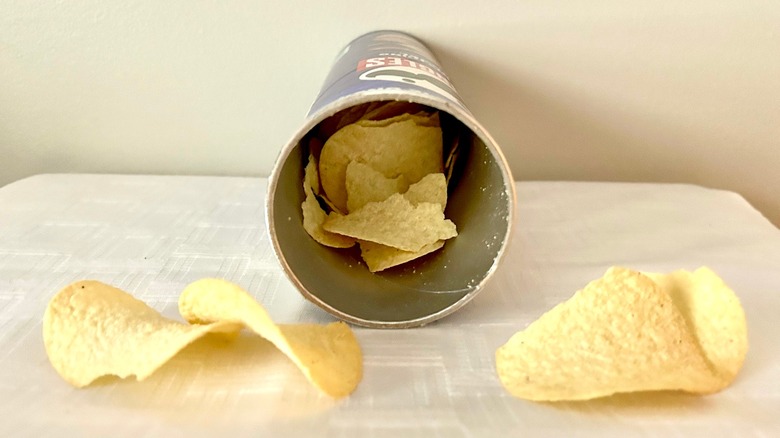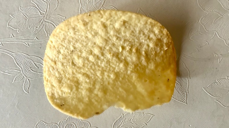 Before getting to the taste of these new potato crisps, we must address the larger-than-average elephant in the room — the revolutionary Pringles container that is supposed to keep these tasty delights uniformly shaped and unbroken. When we peeled back the seal of what appeared to be a completely intact container, all the crisps at the top were broken. We had to empty about a third of the container to find an intact crisp. That is a failure right off the bat that made it quite challenging for us to sample these crisps.
