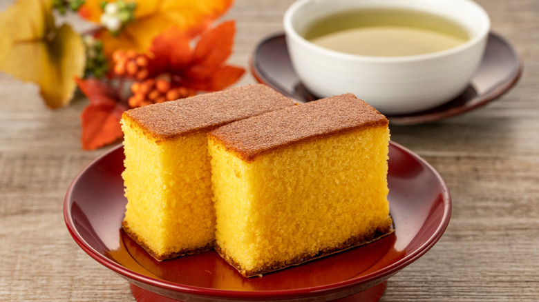 Japanese castella cake consists of only a few ingredients — flour, sugar, water, honey, and eggs. Unlike a traditional sponge cake in the United States, there's no baking soda or baking powder, and instead, it's the eggs that give the cake its fluffy texture. There's also no oil or butter in this recipe, unlike many American baked goods recipes.