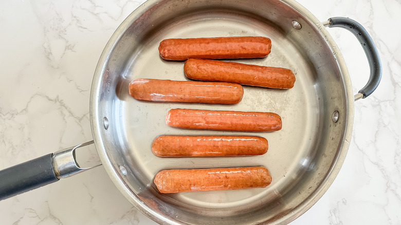 - Poke the brats a few times with a fork. In a large sauté pan, add a few tablespoons of water and the brats. Bring to a boil. Lower to a simmer and cook for 6 minutes.