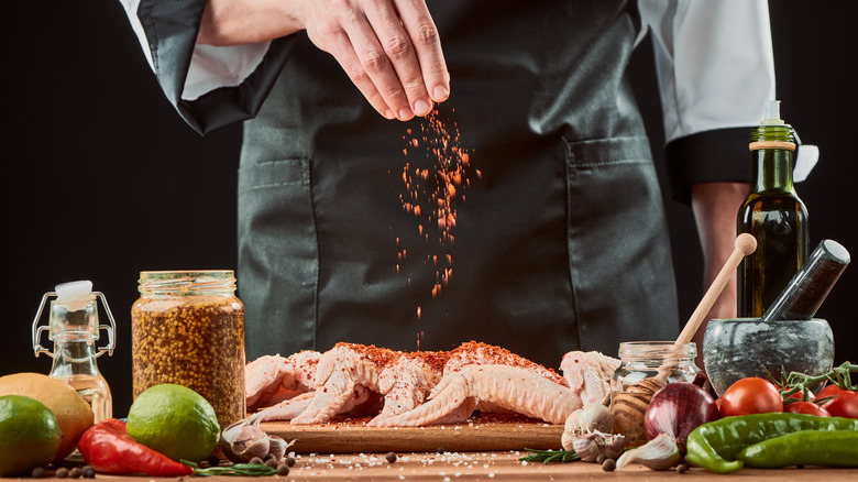 Start by sprinkling baking powder on your chicken wings' skin. Baking powder helps remove additional moisture left on your chicken's skin, ultimately leading to your chicken's skin drying out and getting even crunchier as it cooks. Make sure you avoid baking powder containing aluminum, as this can give your wings an unpleasant aftertaste. You also don't want to mistake baking soda for baking powder, as baking soda can add a not-so-nice aftertaste to your wings.
