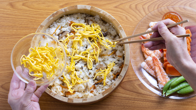 Upon pulling out and uncovering the dish, she tops the salmon rice bowl with soy sauce, sriracha, and Kewpie mayonnaise. The latter is thicker and more flavorful than regular mayo, with a strong umami taste.