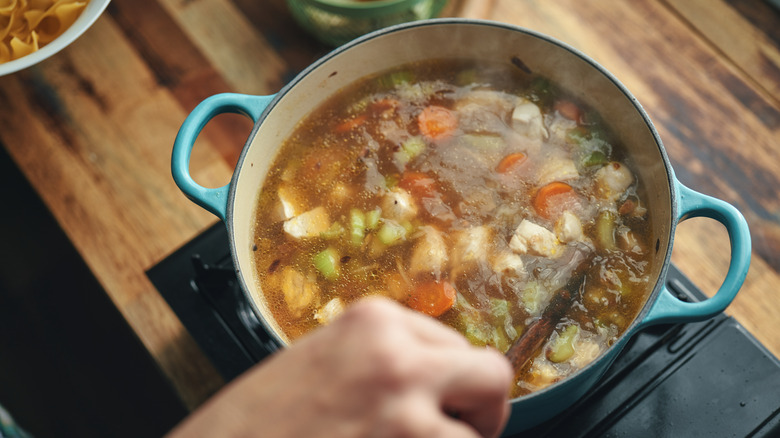Saving your parmesan rinds to add to soup later is one great way to enhance your dish's flavor and take it from a cozy treat to something mind-blowingly delicious that tastes like a warm hug in a bowl. This works because the rind of a parmesan wheel picks up a lot of that nutty, salty flavor from the cheese without adding melty cheesiness. Therefore, parmesan rinds can be used in soups that already utilize parmesan cheese, such as minestrone, and in classically cheese-less soups, like chicken noodle.