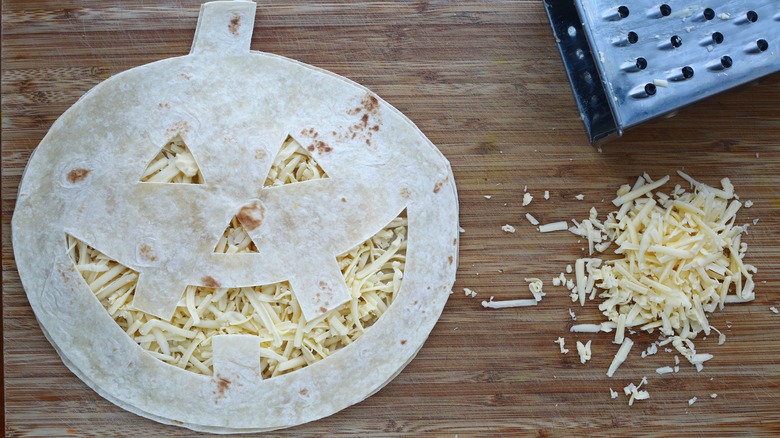 Regardless of the fillings you decide to add, once they're prepped and ready, spread them out onto the base tortilla or divide them amongst several base tortillas if you're making more than one. Next, get the top tortilla and cut a jack-o'-lantern face pattern into it with a knife. Creative folks can cut both tortillas into a pumpkin shape or use a pumpkin-shaped cookie cutter — but make sure you only carve a face into the top tortilla. Otherwise, you'll get gooey cheese and filling all over the place.