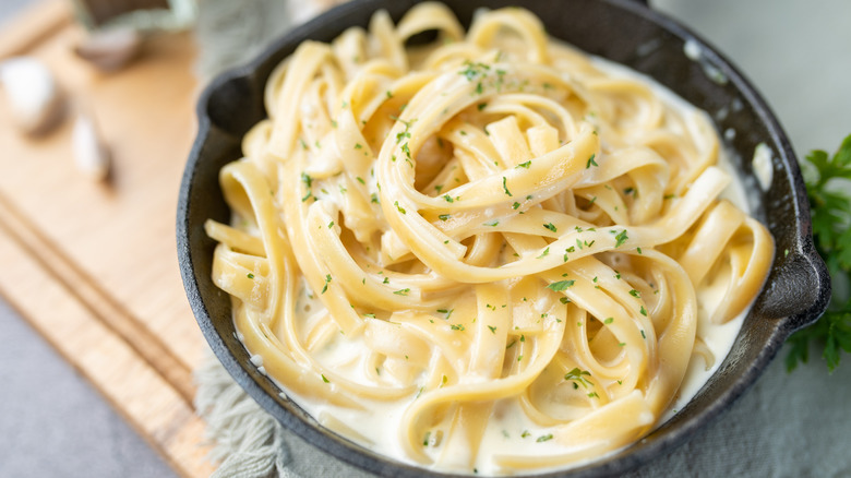 If you go this route, be prepared for cheese overload — in a good way. Alfredo sauce's main ingredients are heavy cream, butter, and parmesan cheese. Pairing it with the mozzarella in Olive Garden's chicken parm is the best thing if you're a true cheese lover.