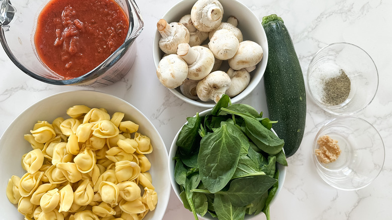 To make this dish, you can start by gathering your ingredients. For this recipe, you will need all of the pasta stand-bys: cheese tortellini, marinara sauce, garlic, and mozzarella cheese. You will also need salt, pepper, mushrooms, spinach, and zucchini.