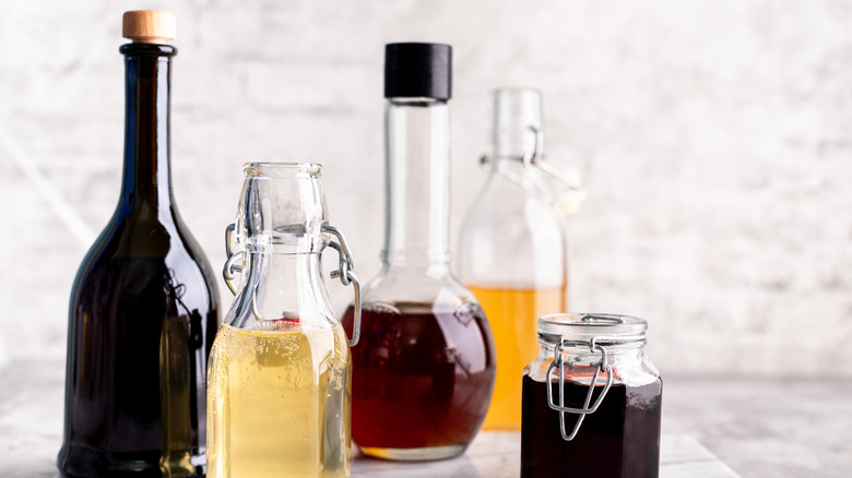 Store-bought dressings are a convenient item to have in the pantry for adding flavor to your homemade salads. Not everyone has the wherewithal to whisk them up entirely from scratch, especially if only a small amount is needed. That said, some store-bought salad dressing can fall a little flat, requiring you to make tweaks at home. Acidic ingredients are a great way to perk up any recipe, and what better acid to employ in this case than a splash of vinegar?