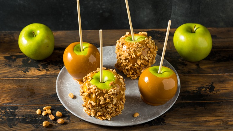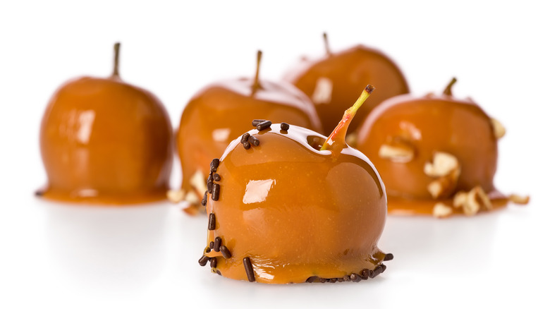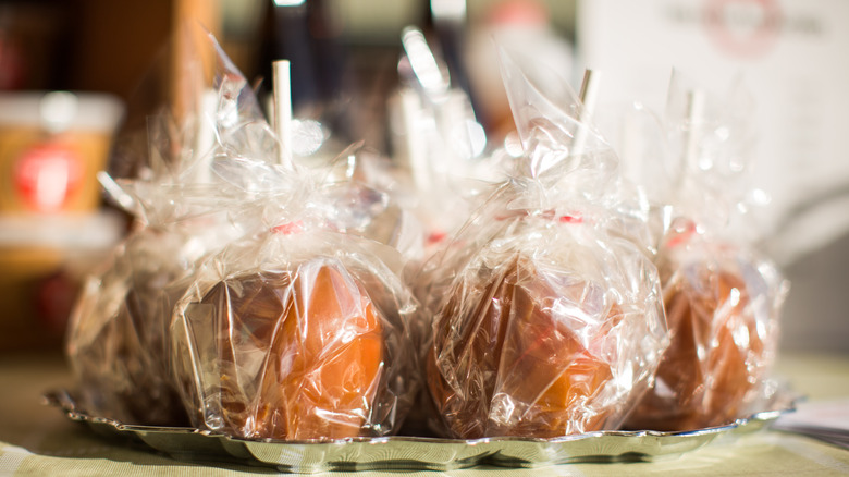 Once you finish decorating the caramel apples, don't just leave them out on the counter. Not only does it take longer for the caramel to stiffen, but if you leave them out overnight, it's not necessarily the best practice. Although it's much easier to chew the caramel at room temperature than cold from the fridge, it's not worth it to take chances. When the desserts remain at room temperature for extended amounts of time, it increases the chance of foodborne illnesses like listeria infections, according to Nationwide Children's Hospital.