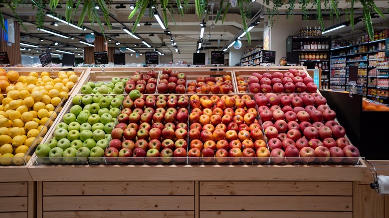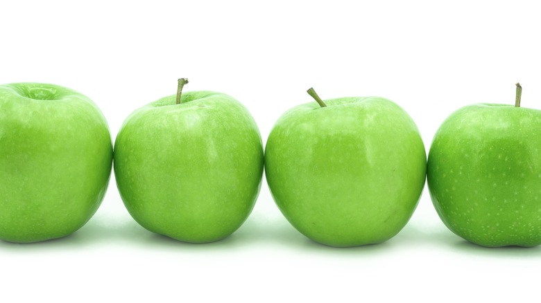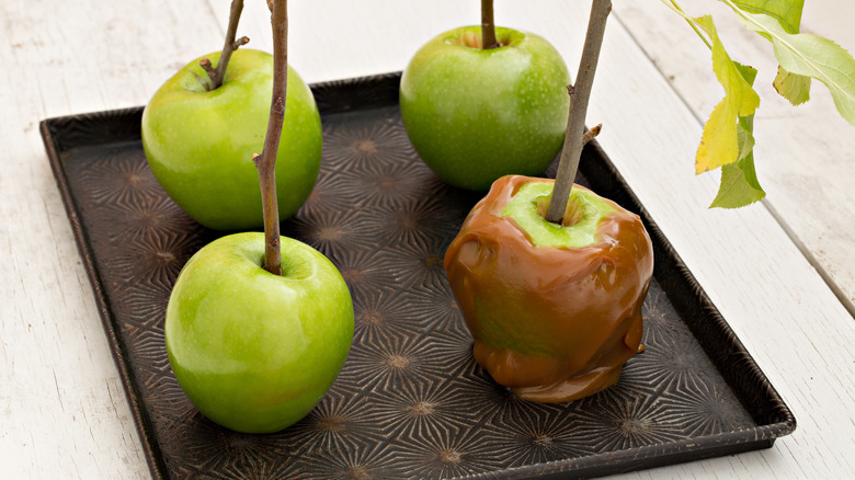 Furthermore, it's wise to cool the apples in the refrigerator before you start your project because the trick to a perfect caramel apple is all in the temperature. A room-temperature apple isn't necessarily a bad thing, but it doesn't do anything to help you. On the other hand, if the caramel is warm and it touches the chilled apples, it has an easier time firming up. This practice prevents the coating from dripping down the apple immediately when you set it on the tray. At a minimum, allow the apples to reside in the cooler for a few hours. If you want to go all out, work a day in advance and refrigerate them overnight, which guarantees they don't return to room temperature as soon as you take them out.