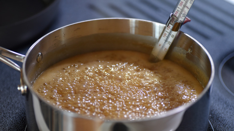 Don't try to guess when your caramel is ready based on looks alone because you might end up with under or overcooked caramel. Since sugar can be finicky to work with, you might remove it from the heat prematurely, then when you go to coat the fruit, it never sets. Contrarily, caramel burns quickly once it reaches very high temperatures. If you overcook it, it can turn out more like a hard candy, which makes it difficult to bite into the apple and gives it a bitter taste. To avoid this, examine the mixture's temperature with a candy thermometer while it cooks.