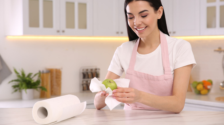 Once you remove the wax from the apple, you're on the right path, but that doesn't mean you can go straight into dipping them. If you don't take the time to dry them, the caramel slides right off the fruit after you dip it because it doesn't have the apple's texture to cling onto. This is extremely disheartening, especially when you need to make them for an event, and usually, people don't even realize what caused the caramel to slide like that. Fortunately, all you need to do is take a paper towel or linen and wipe off any excess water so that they are dry to the touch.