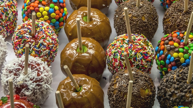 Sea salt also provides a similar flavor outcome — who doesn't love salted caramel? You can also melt some white or dark chocolate and use a pastry bag to draw lines and different designs on the caramel, which is an easy way to make them festive for the holidays. Namely, you can color the chocolate to make candy corn caramel apples. Other fun toppings include M&M's, Fruity Pebbles, shredded coconut, toasted sesame seeds, or trail mix.