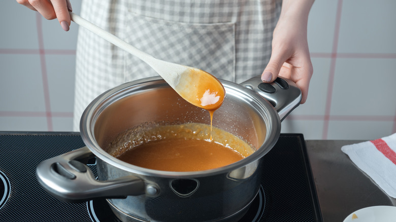 Even though you might habitually stir chocolate or other sauces when you cook them, the same doesn't apply to caramel. You can't agitate it too much if you want the mixture to have the right texture. The sugar needs time to melt, bubble, and cook without touching the sides of the pan prematurely. But what exactly is the science behind why you shouldn't stir your homemade caramel? Well, when you insert a spoon or whisk into the mix, any sugar that comes in contact with the colder sides of the pot can crystallize once the water evaporates.