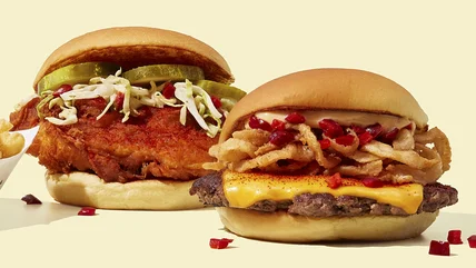 The Hot Chicken sandwich starts at $8.39 and features a hot pepper-spiced and fried white chicken patty, pickles, and cherry pepper slaw on a bun. The Spicy ShackMeister Burger is an Angus beef patty seasoned with a hot pepper spice blend, crispy onions, cherry peppers, and ShackSauce, starting at $7.99.