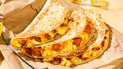 The fast food chain currently offers a morning-friendly take on the Crunchwrap: scrambled eggs, a hash brown patty, cheese, and the customer's choice of bacon, sausage, or steak, all packed inside a tortilla. Customers can also order a variety of breakfast burritos and quesadillas, as well as a la carte hash browns and Cinnabon delights.