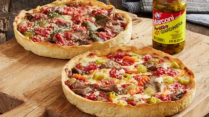 The Lou Malnati's x Portillo's Italian Beef Deep Dish starts with the classic Lou Malnati's butter crust, known as one of the best deep dish pizzas in the U.S. After adding sweet plum tomatoes and Wisconsin mozzarella, Portillo's Italian beef tops those ingredients. Served with either sweet peppers or hot giardiniera, the frozen, ready-to-bake pizza allows everyone to have the best of these favorite Chicago foods at home.