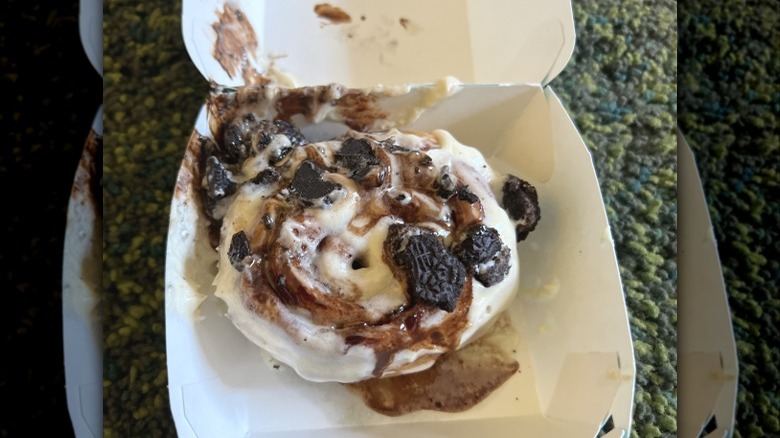 It's not clear if any of the Oreo vanilla cream was involved in this concoction, but the lack thereof (or the lack of knowledge thereof) didn't stand in the way of this Bon-coction. The chocolate cookie part of an Oreo normally has such a strong, dominating taste, and what's really nice here is that the Oreo cookie pieces are soft and crumbly, and mesh in quite well with the Cinnabon and the drippy Ghirardelli sauce. There's a lot going on here, but however you slice it, both literally and figuratively, it's a taste explosion well worth diving into. The bonus aspect of the Oreo Bon is any excess shrapnel that lands on the box or plate, is a treat all its own.