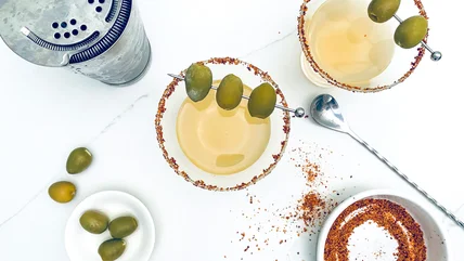 - Make the spicy rim by pouring 1 tablespoon olive brine into a wide, shallow dish. Add the chili-flavored salt to another wide, shallow dish.