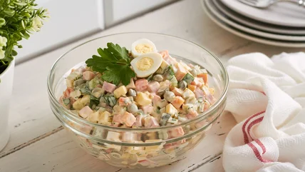Russian salad is an equally tasty compound variety that features an even greater combination of ingredients. Along with carrots and a mayo-based dressing, Russian salad also contains potatoes, peas, eggs, and pickles. This salad is filling, so it's perfectly fine being served as an entrée. However, small portions can also accompany other foods. If you're looking for a tasty appetizer, it even works beautifully as an addition to crusty bread.