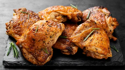 Although perfectly cooked, minimally seasoned chicken thighs can be a great meal, if you want to change things up there are plenty of delicious spice and marinade combinations that can add delicious pizazz to chicken thighs. Try coating the chicken thighs in olive oil and then rolling them in a combination of paprika and Italian seasoning plus some onion powder, garlic powder, salt, and pepper. Using a dry rub to add flavors that complement the chicken thighs is easy and fast because they don't require time to marinate.