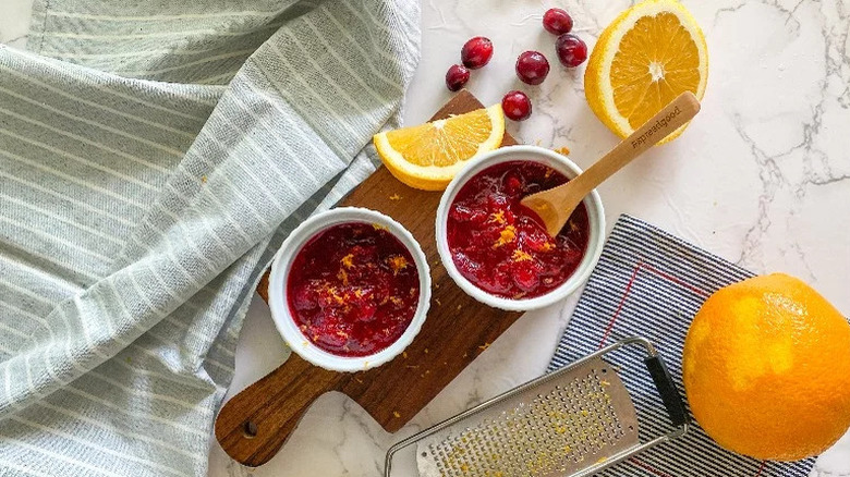 Dissolve the sugar in water by heating it on the stovetop, then add the cranberries. Simmer the mixture until you notice the cranberries popping, then gently mash them. Lastly, add the zest before you allow the sauce to cool into a jammy consistency. Decorate it with fresh rosemary or candied orange zest.